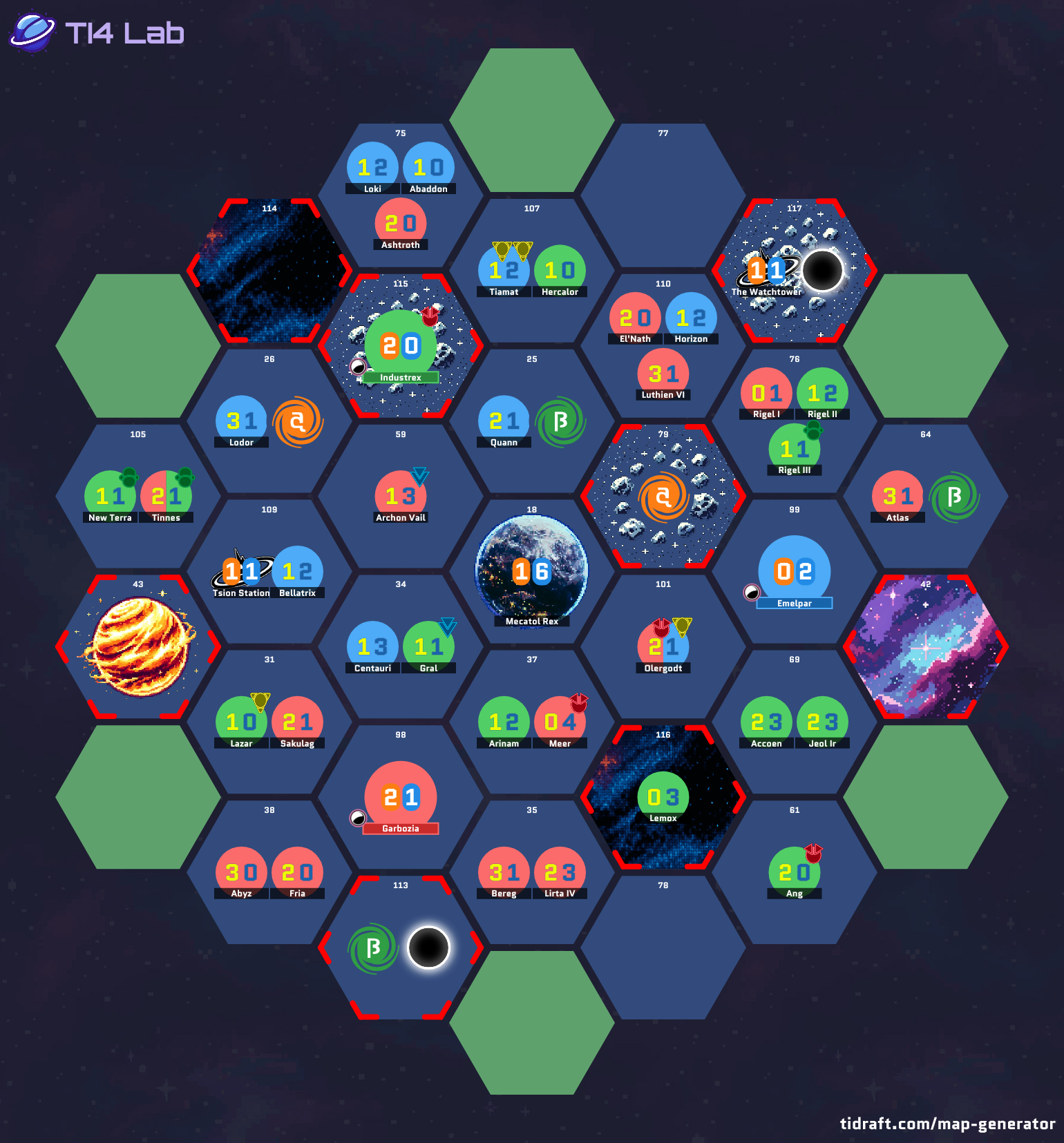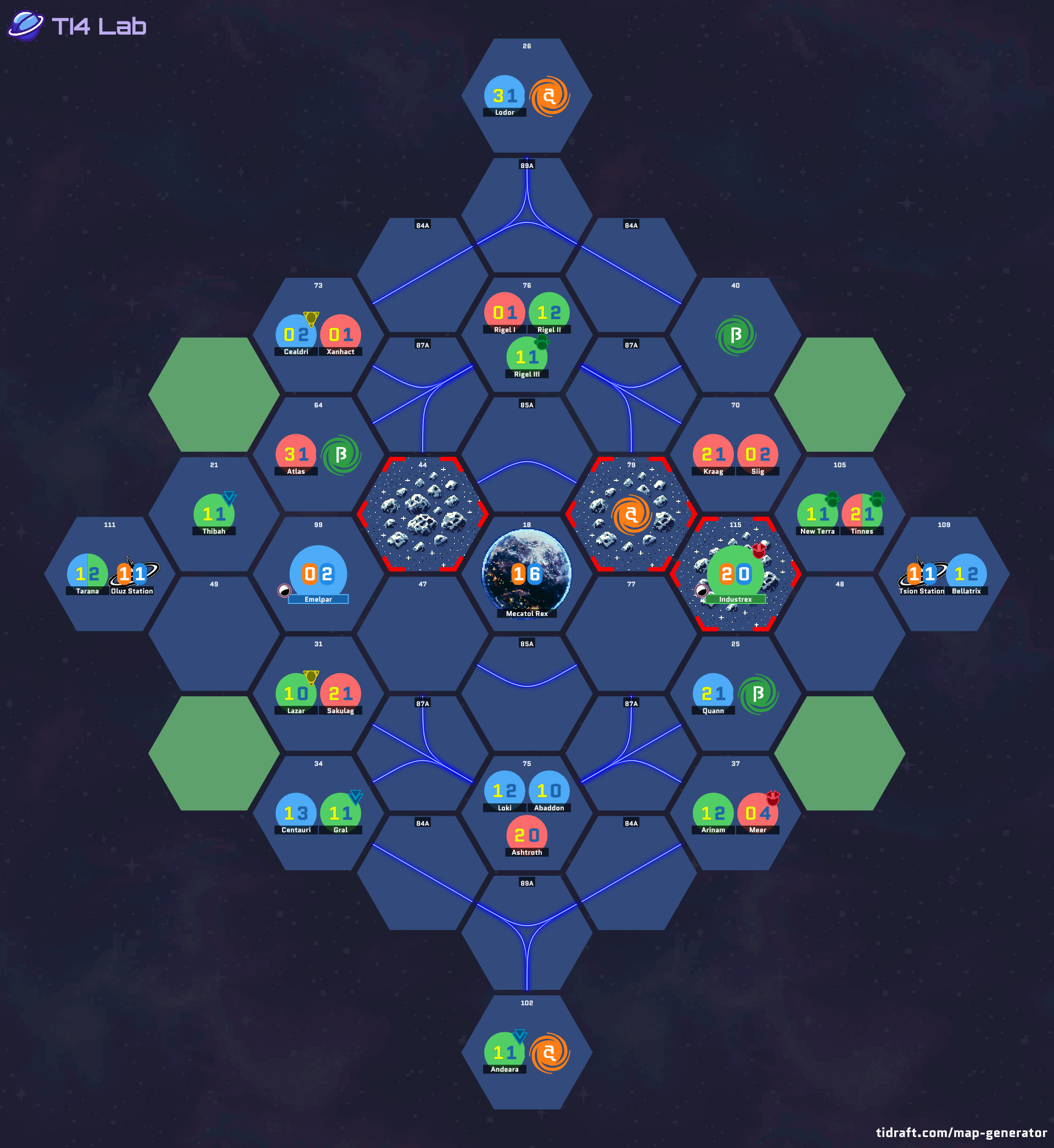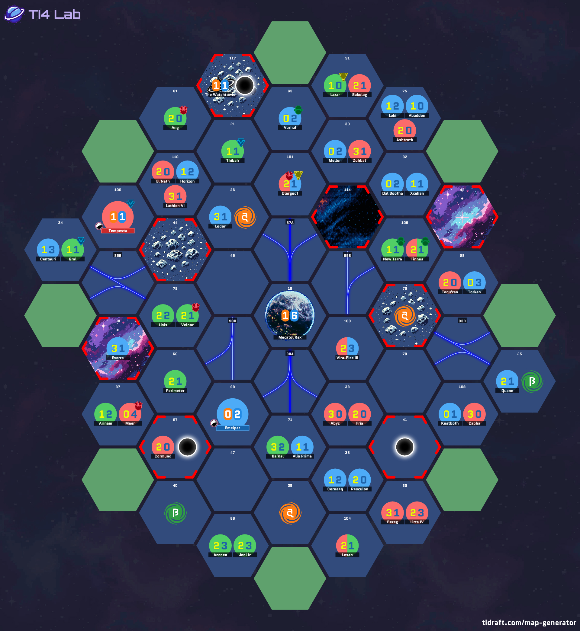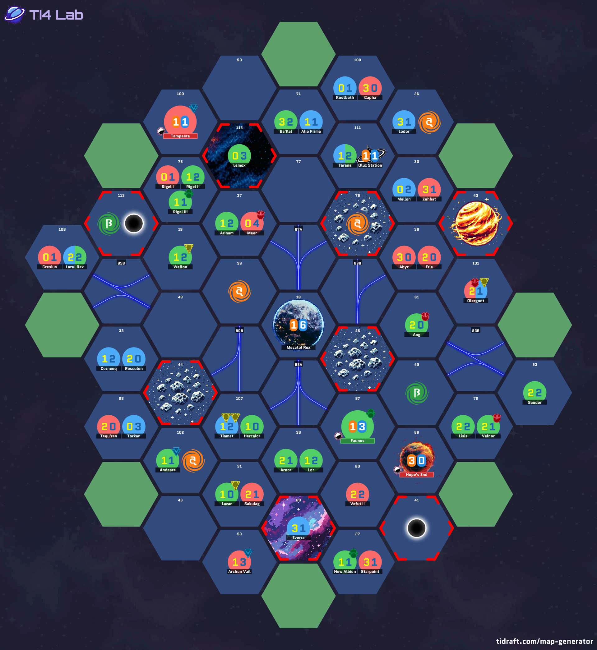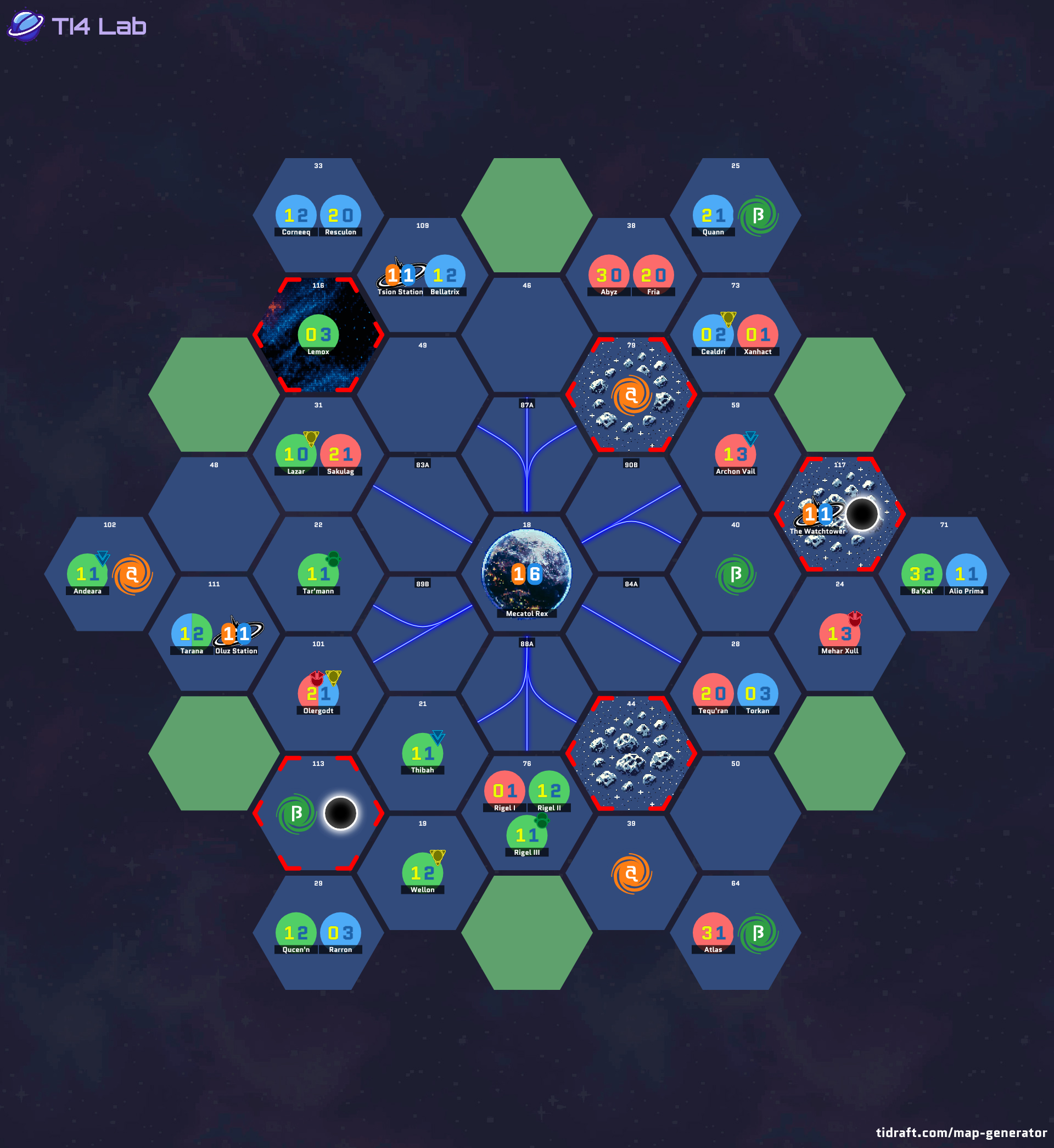 This map used hyperlanes to create an asymmetric map that creates more paths between home systems and places several players a system closer to Mecatol Rex, while also placing 1 player further away.