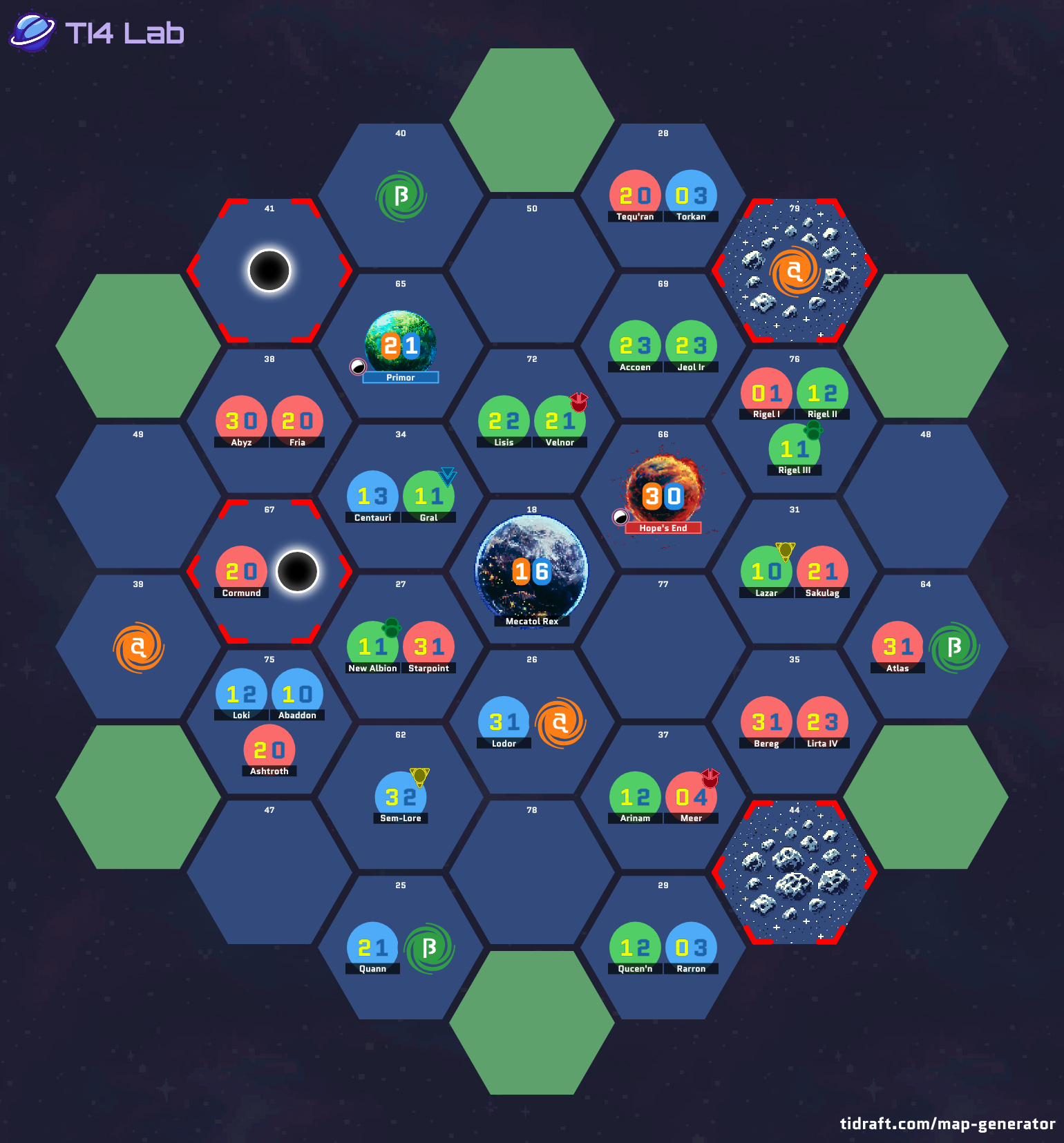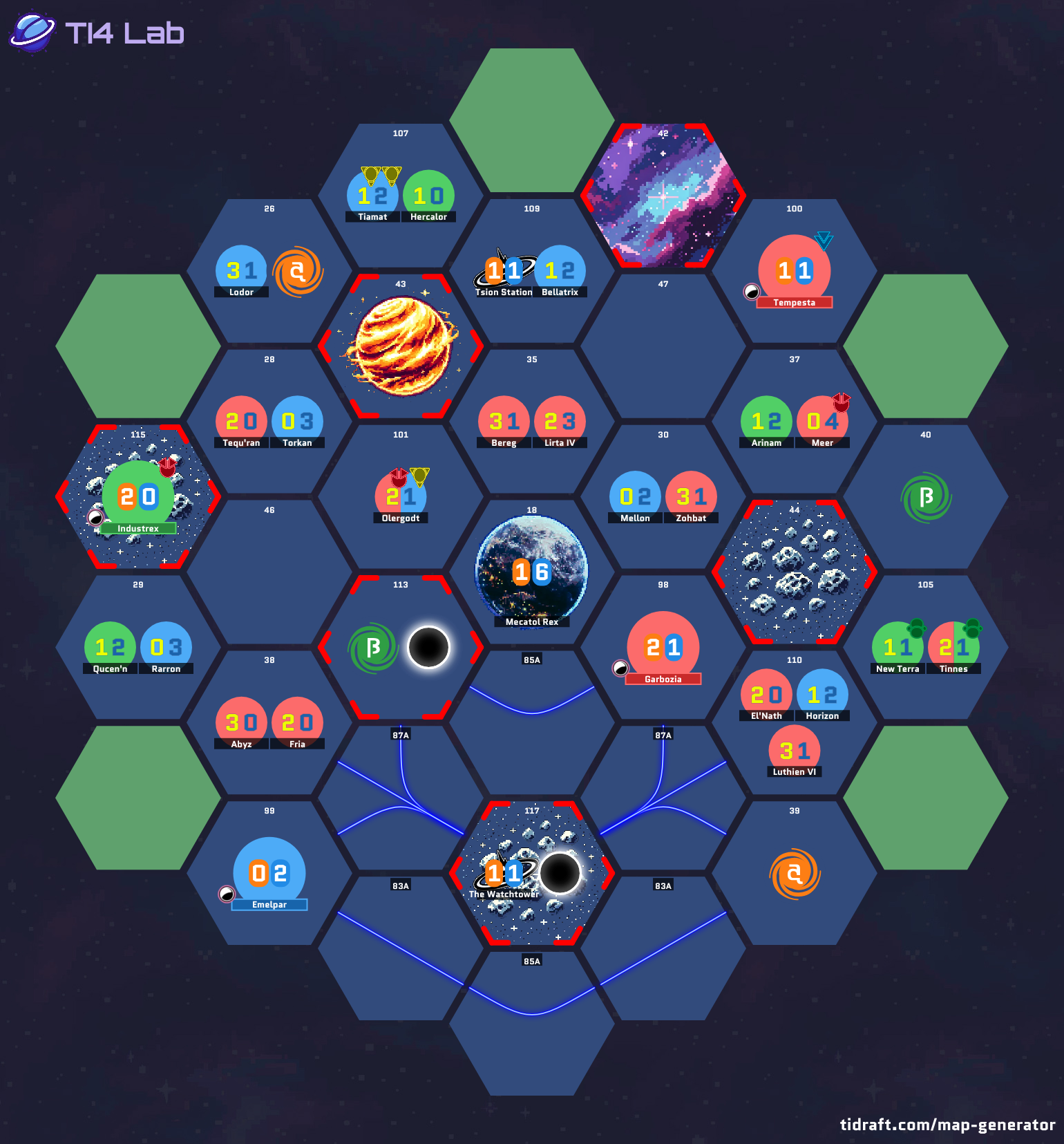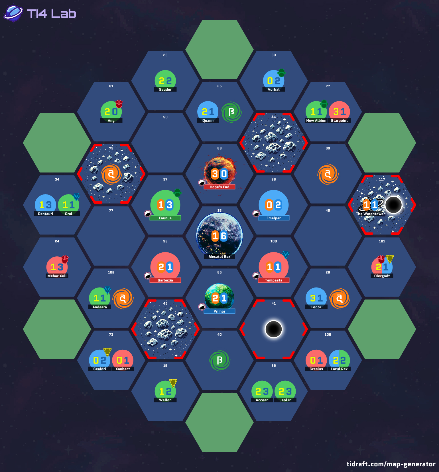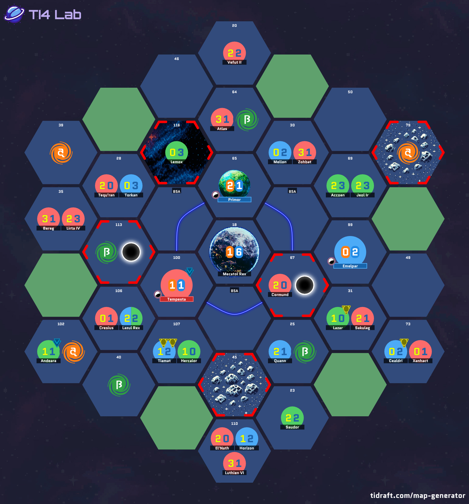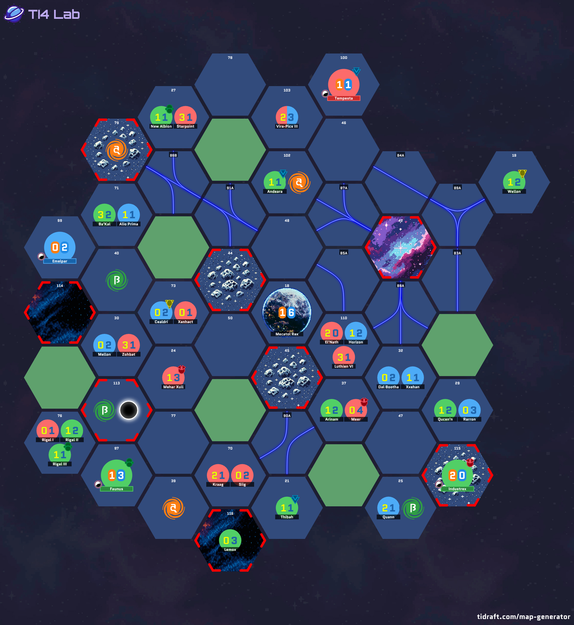 This map used hyperlanes to create an asymmetric map that creates more paths between home systems and places several players a system closer to Mecatol Rex, while also placing 1 player further away.