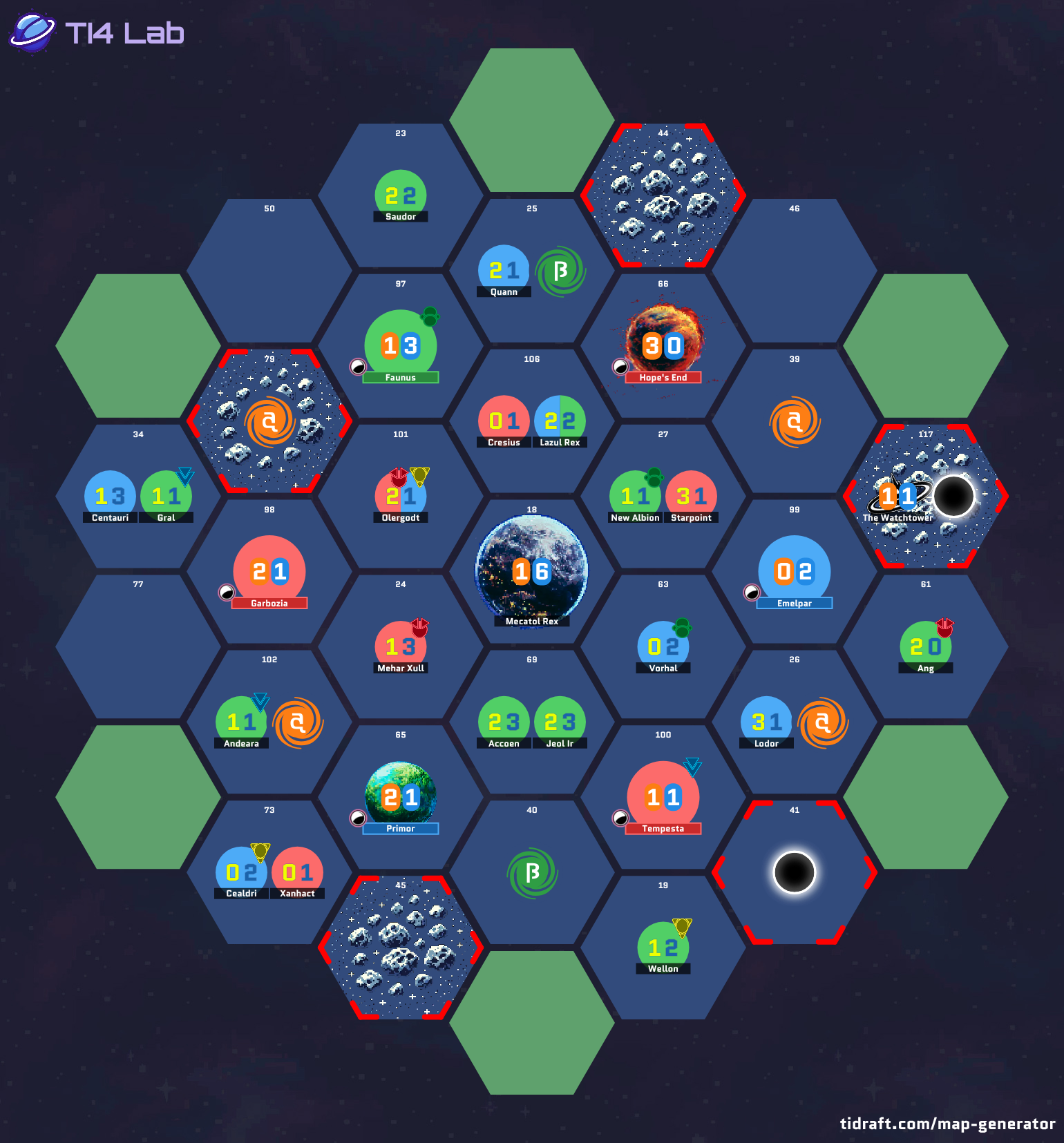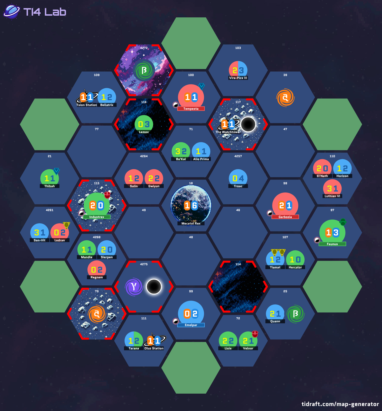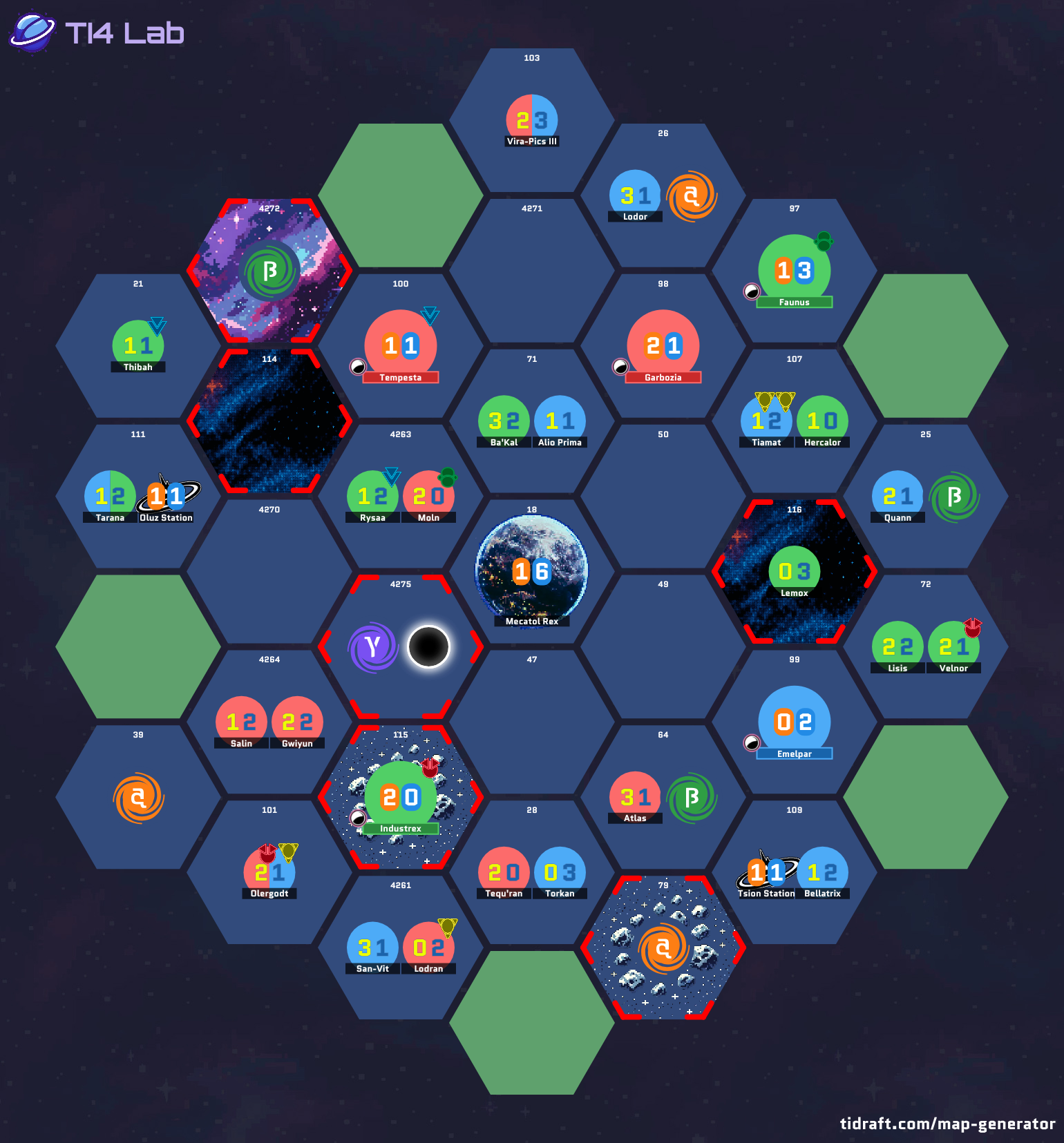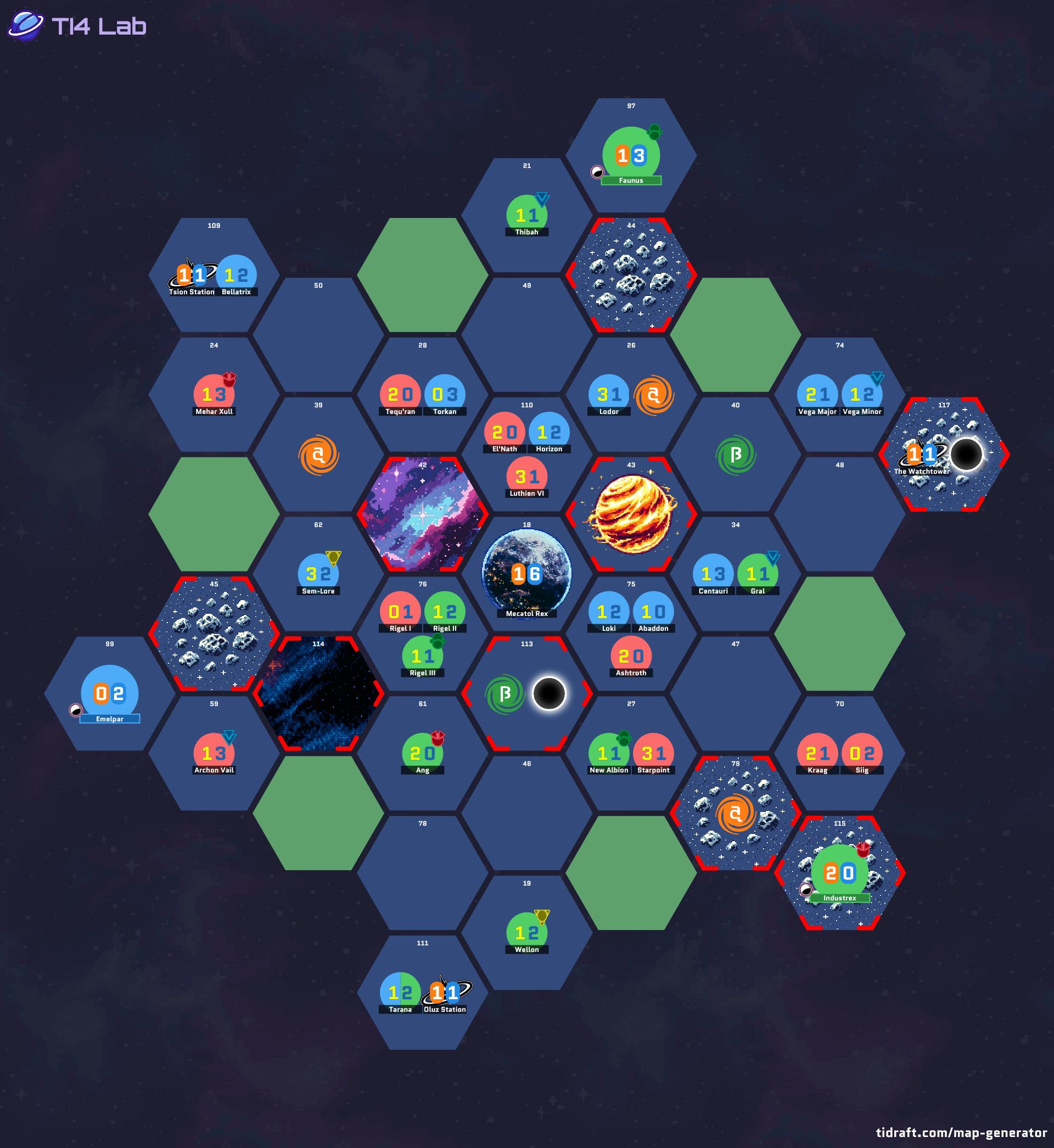 This map puts everyone closer to Mecatol without squishing the map together. Everyone also has 1 extra equidistant slot, making it a map where players must compete or negotiate for resources.